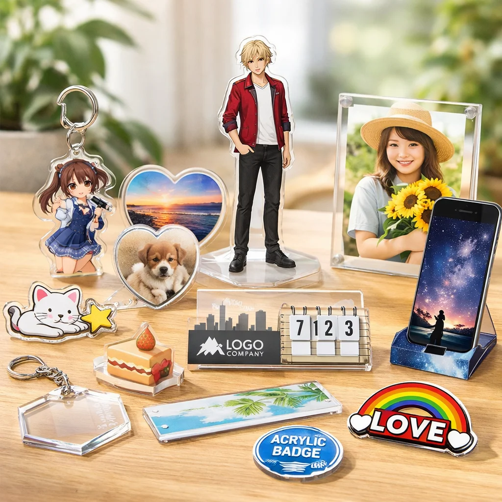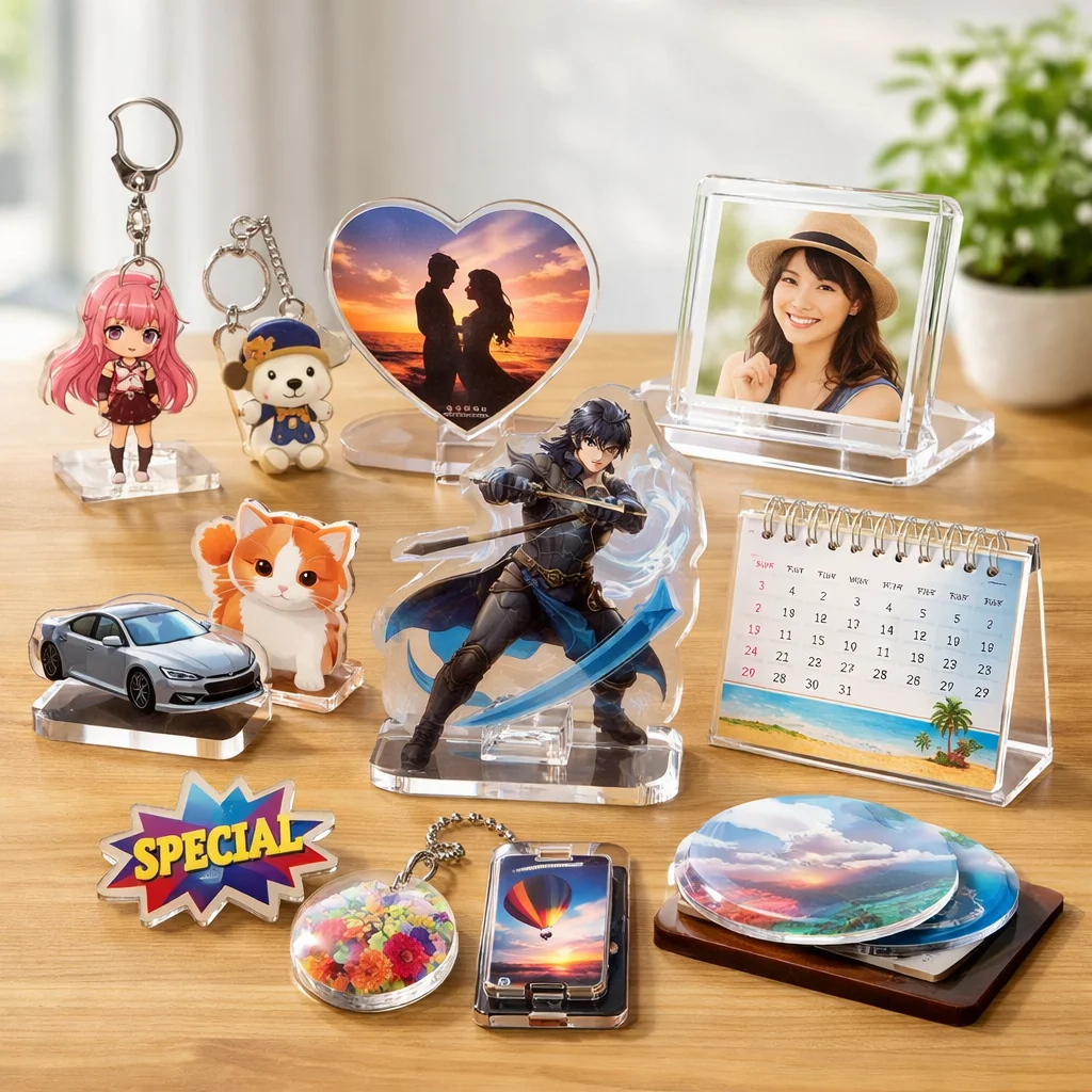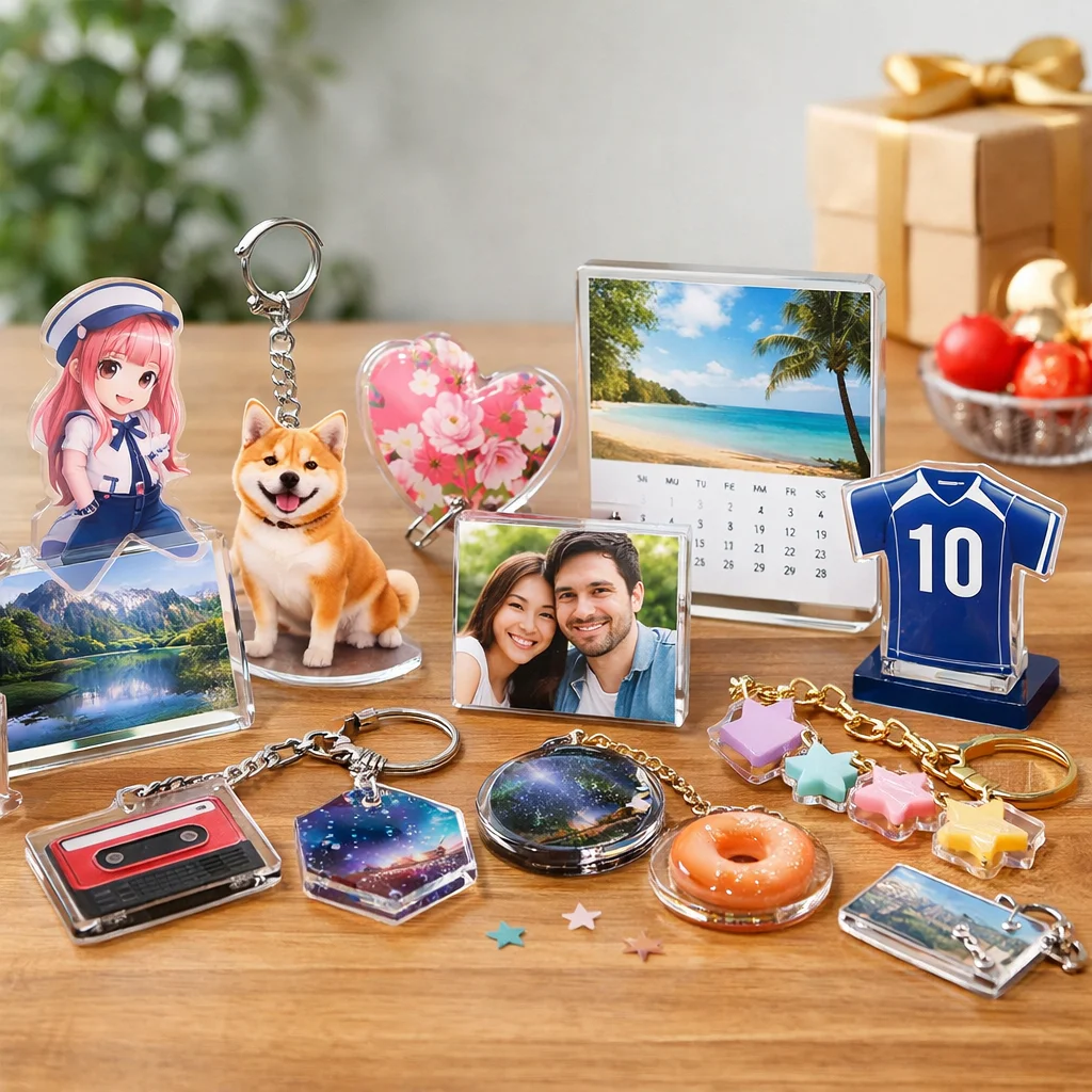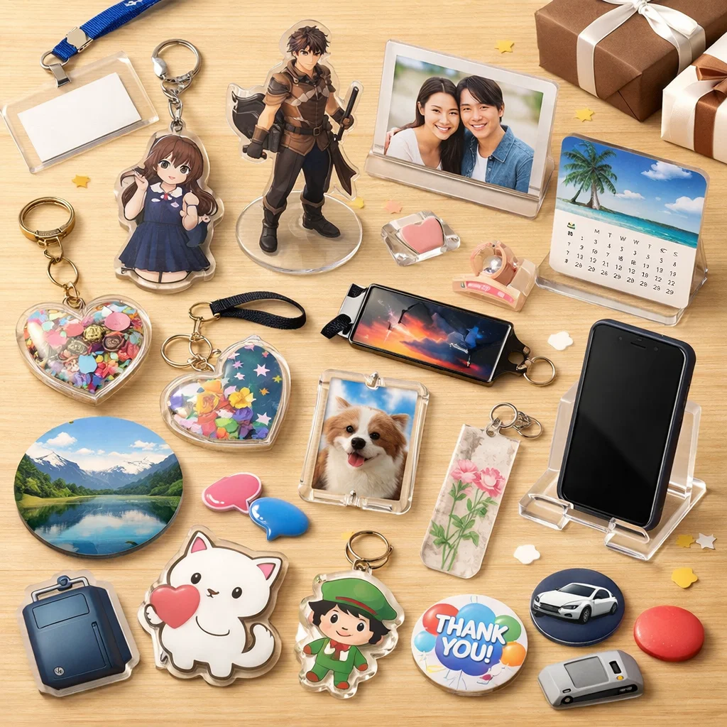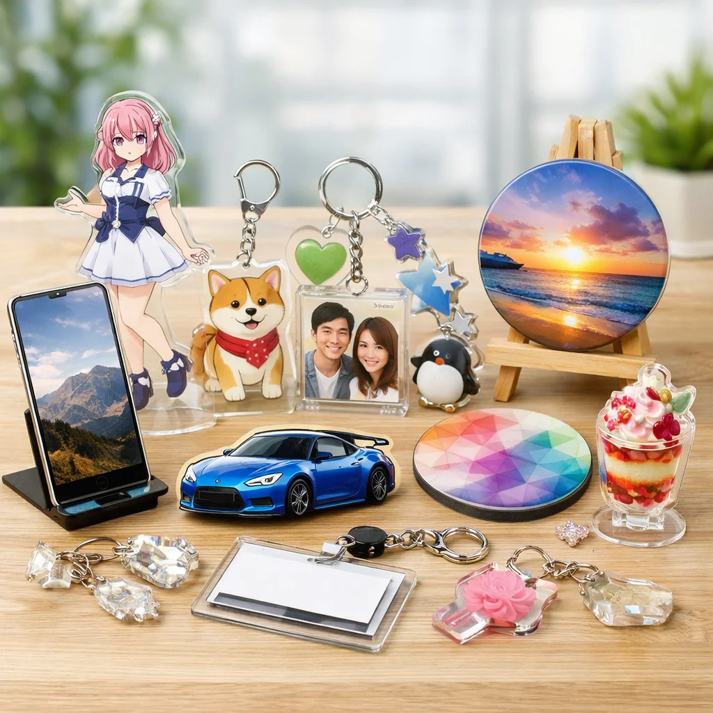 アクリルグッズの魅力は、その多様性にあります。商品カテゴリとして、キーホルダー、スタンド、プレートなど、さまざまな形状やデザインが可能です。これにより、企業のロゴやキャラクターをアクリルグッズに落とし込むことで、ノベルティとしての効果を最大化できます。
