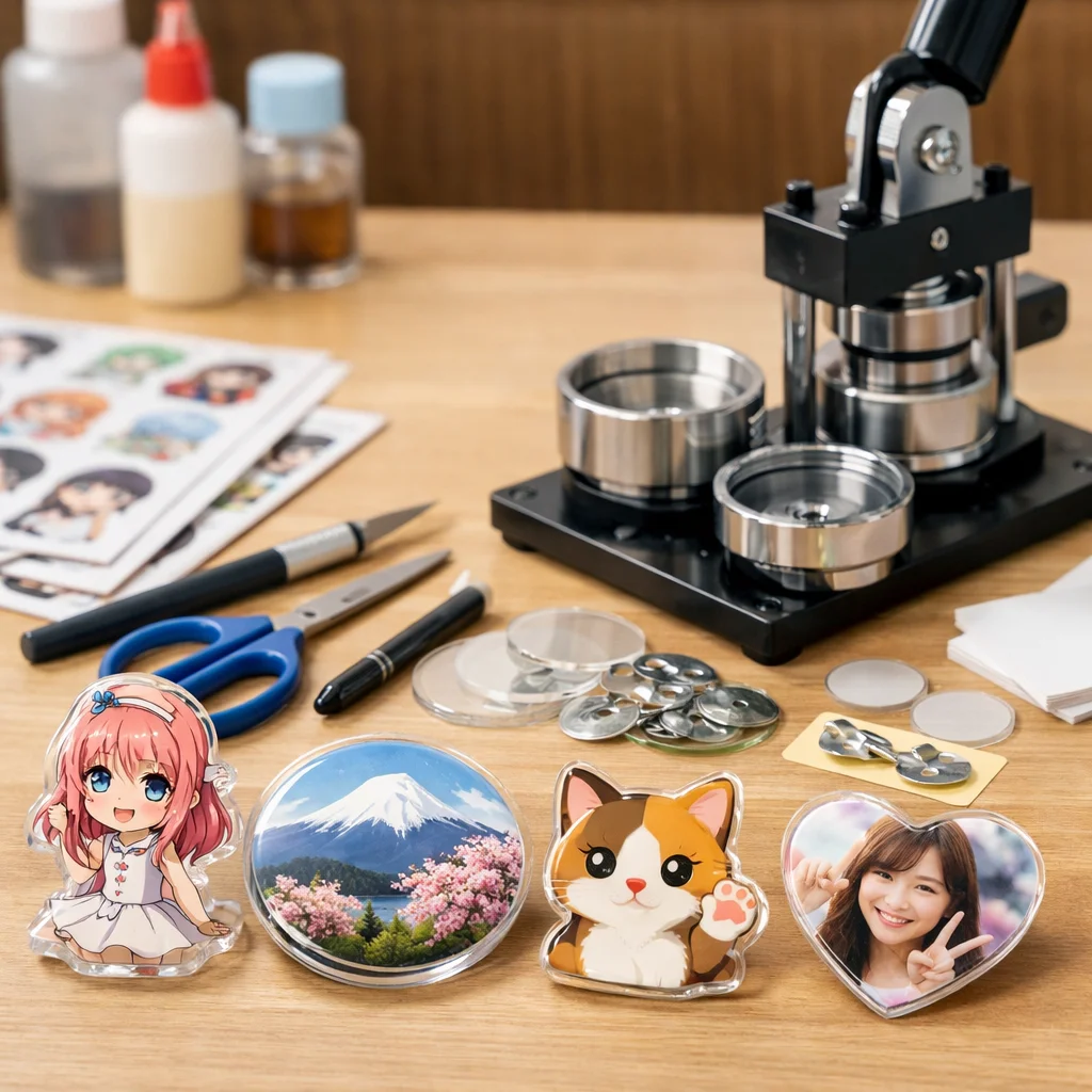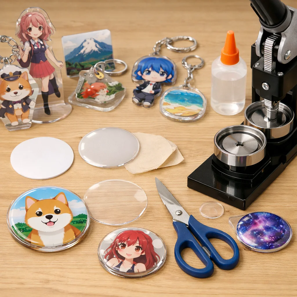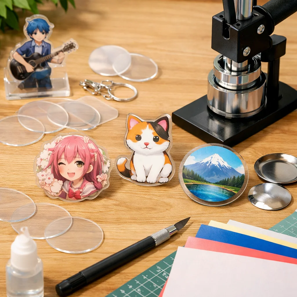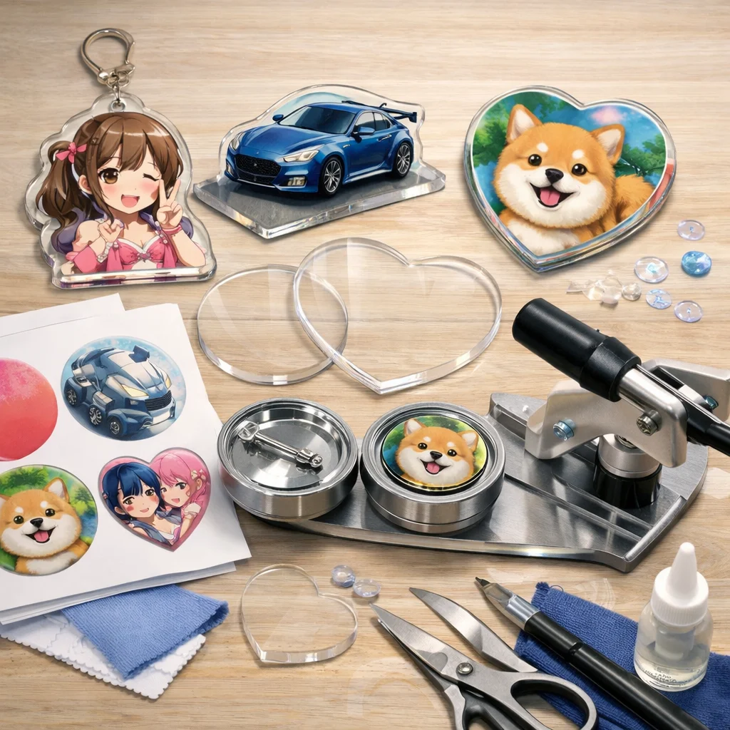 アクリルグッズのバッジ制作は、クリエイティブな楽しみが詰まった作業ですが、正しい材料と道具を使うことで、仕上がりの質が大きく変わります。ここでは、バッジ制作に必要な「最低限セット」と「あると仕上がりが上がる道具」に分けて、各アイテムの役割や選ぶ基準、代替案を詳しく説明します。これを参考にすれば、初心者でも自信を持って アクリルグッズ を作成できるでしょう。