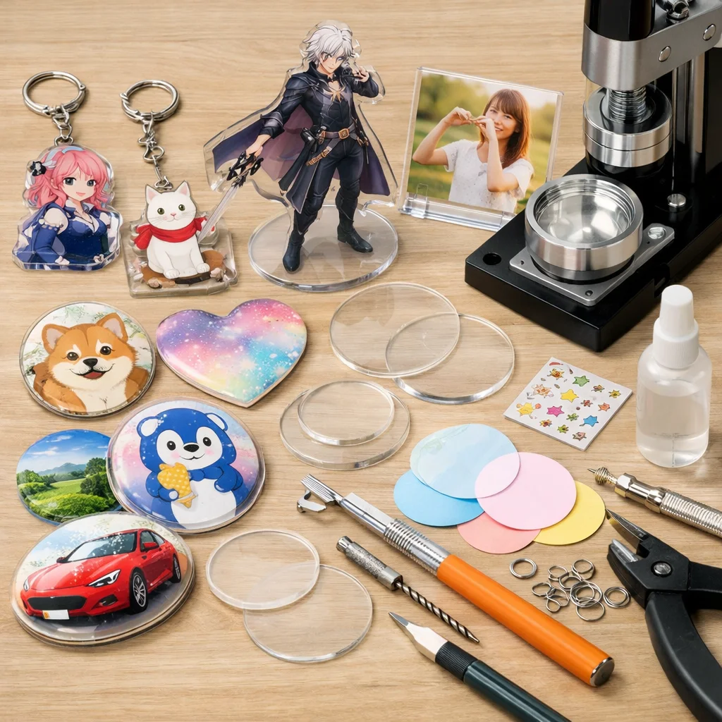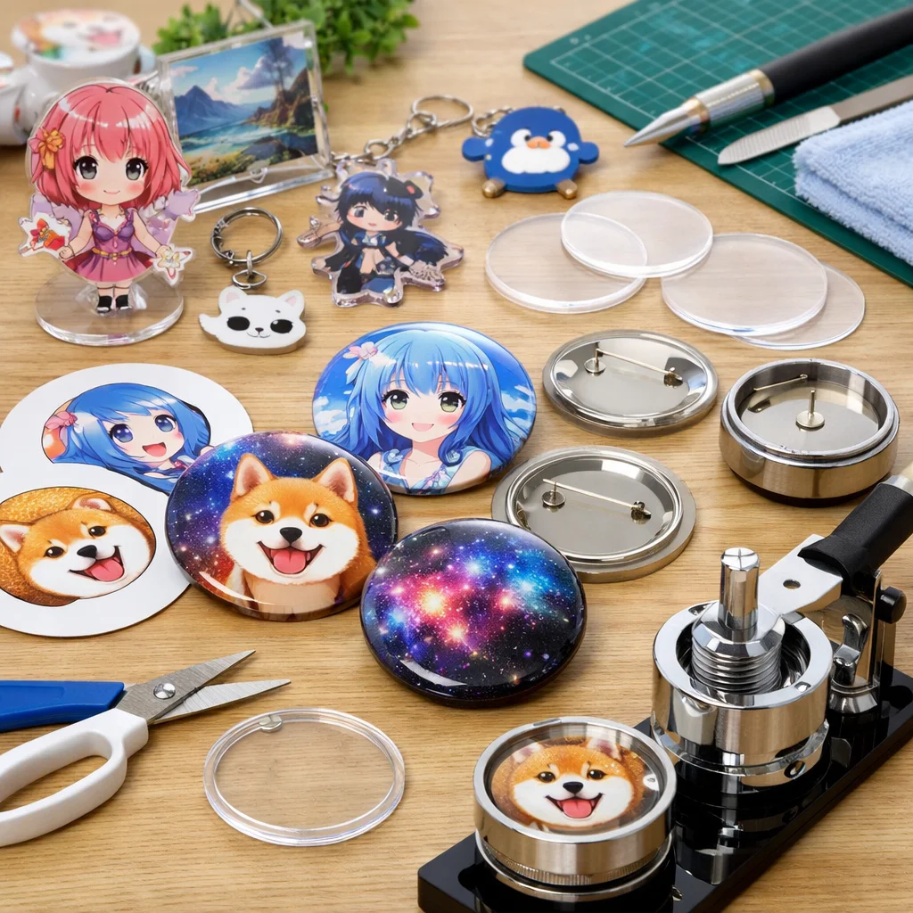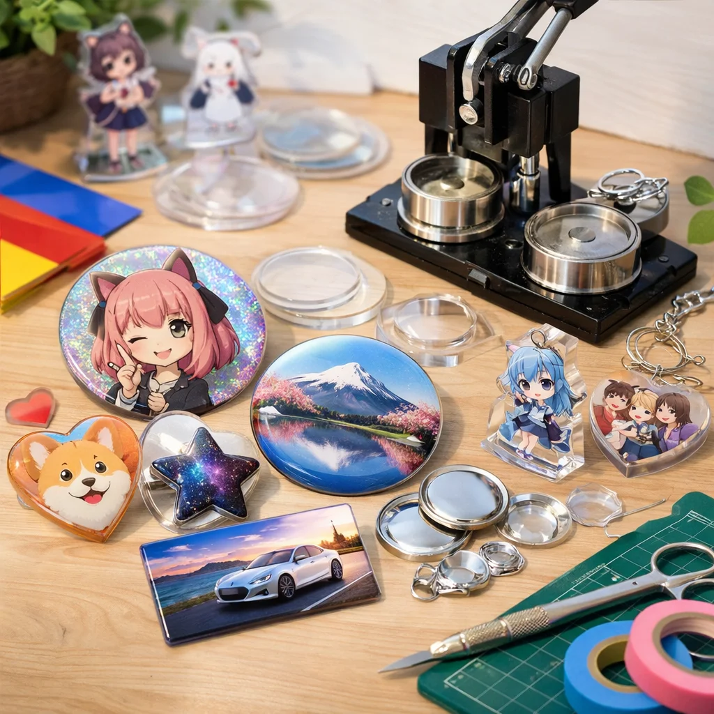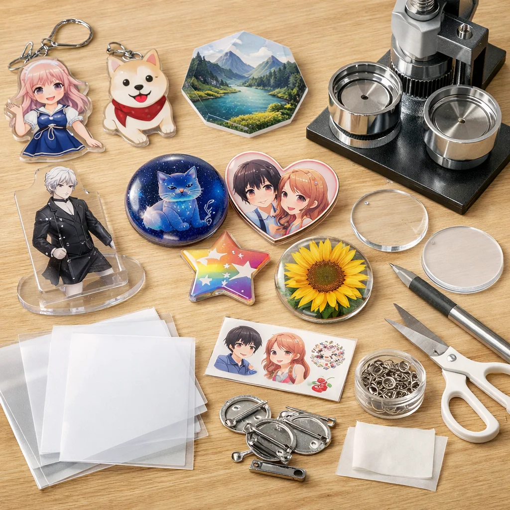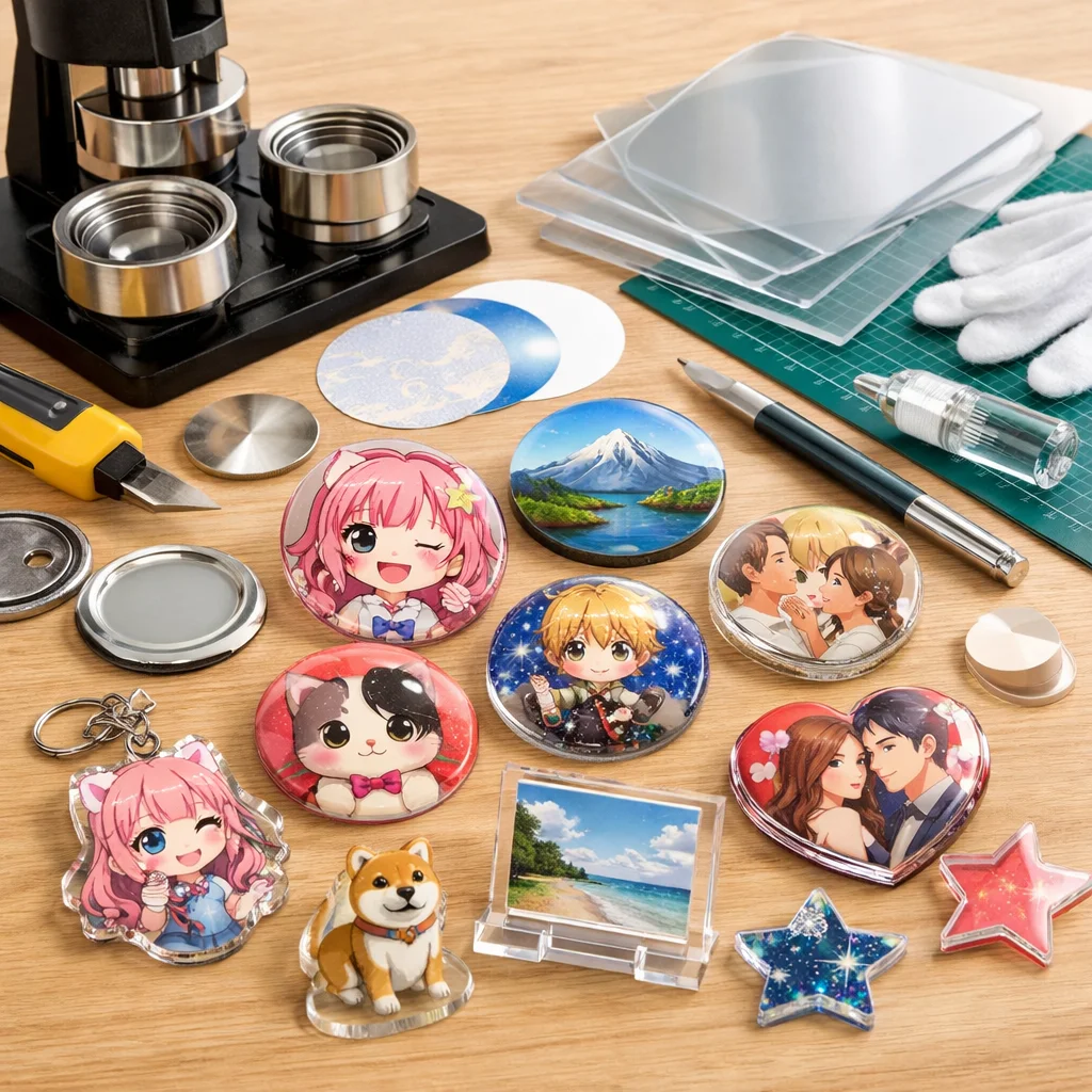アクリルグッズのバッジ制作は、クリエイティブな楽しみが詰まった作業ですが、正しい材料と道具を使うことで、仕上がりの質が大きく変わります。ここでは、バッジ制作に必要な「最低限セット」と「あると仕上がりが上がる道具」に分けて、各アイテムの役割や選ぶ基準、代替案を詳しく説明します。これを参考にすれば、初心者でも自信を持って アクリルグッズ を作成できるでしょう。