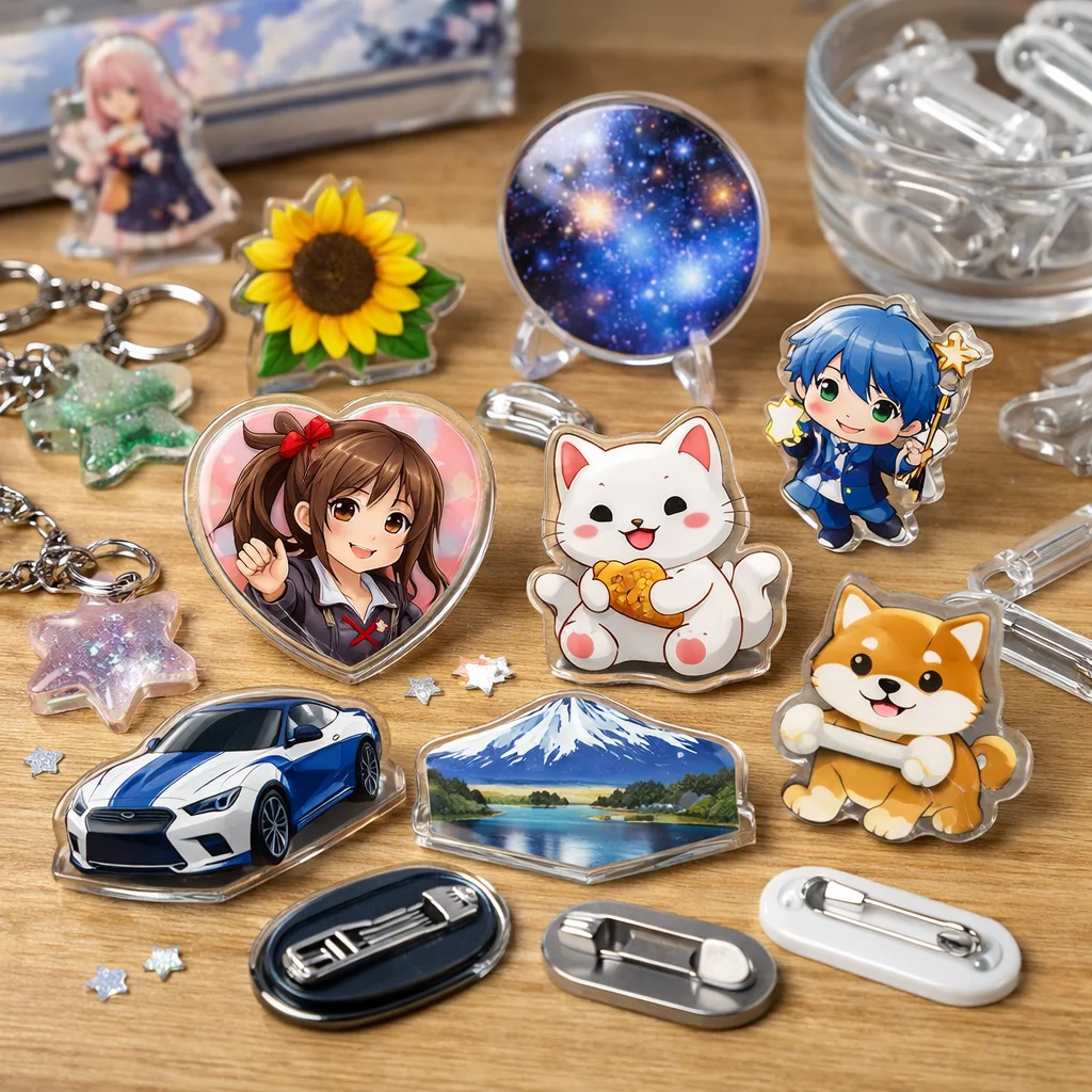 アクリルグッズの中でも特に人気のある商品カテゴリがバッジです。この章では、初心者がアクリルグッズのバッジ制作の全体像を把握できるよう、アクリル素材の特性やバッジの用途について詳しく解説します。