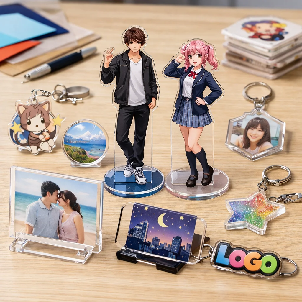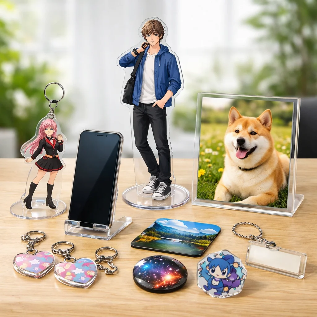 アクリルグッズは、その透明感と耐久性から、多くのファンや企業に愛用されています。特に、アクスタ(アクリルスタンド)は、キャラクターやロゴを立体的に飾ることができるため、商品カテゴリの中でも人気のアイテムです。